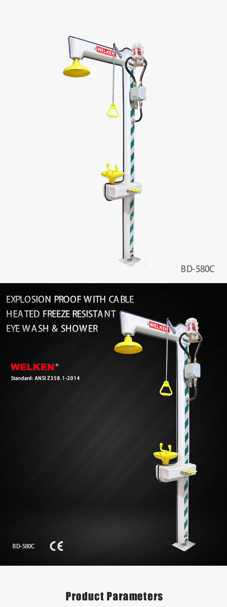 BD-580C is an outdoor freeze-resistant eyewash/shower with alarming functions for emergency aid and first treatment in temperature from -35℃~45℃, The alarm will work or send a sign to the controlling room when eye wash is open. It is mainly composed of pipe (SS304), heating tape, inner heat layer, outside heat layer, combined aural and visual alarm, flow switch and explosion proof junction box.